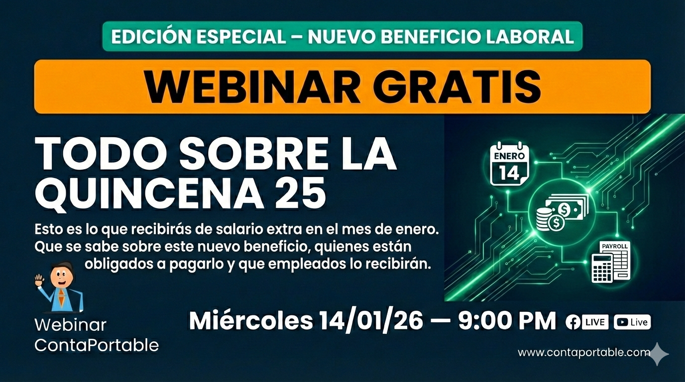 Un nuevo beneficio laboral en El Salvador que impactará directamente en cómo calculas y registras tu nómina este año. ¿Qué se sabe sobre este nuevo beneficio? En nuestro próximo webinar de ContaPortable resolvemos las dudas más críticas: 📅 Fecha: Miércoles, 14 de enero de 2026 🕘 Hora: 9:00 PM 💰 Inversión: TOTALMENTE GRATIS. 📍 Plataformas: […]