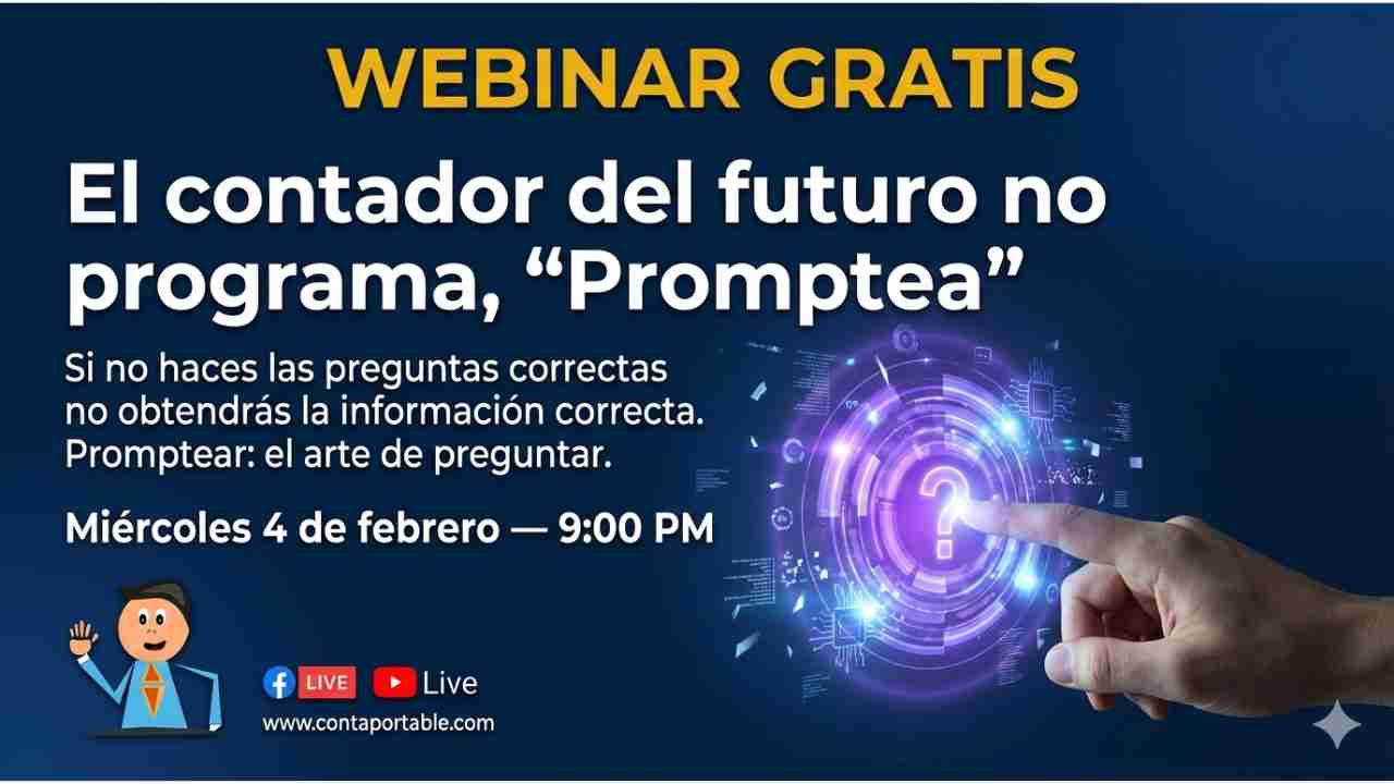 Sino haces las preguntas correctas no obtendrás la información correcta. Promptear el arte de preguntar. «WEBINAR GRATIS» 📆Día: Miércoles 04 Febrero 2026 🕤Hora: 9:00 PM 📍Lugar: YouTube y Facebook Live ✅ Inscríbete al siguiente enlace para que recibas una notificación cuando iniciemos y el material del webinar: https://www.contaportable.com/inscripcion-webinars/